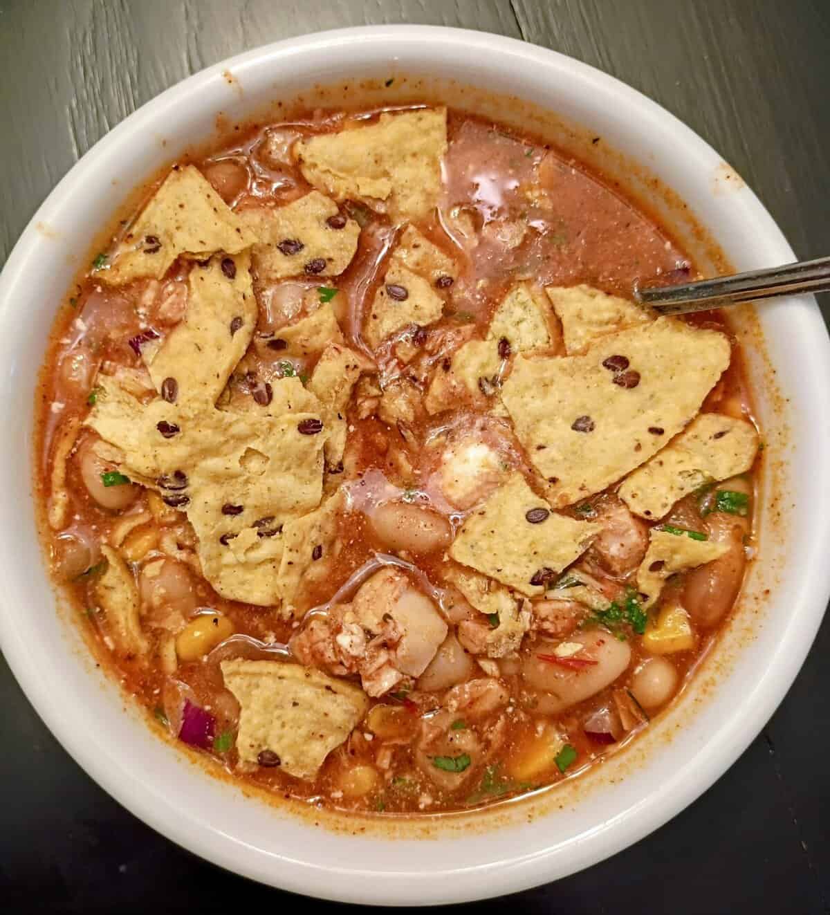 This taco soup boasts a tantalizing Southwest flavor (like this Crockpot Chicken Enchilada Soup), and the lovely contrast of the creamy beans with the crunchy chips pleases with every bite.