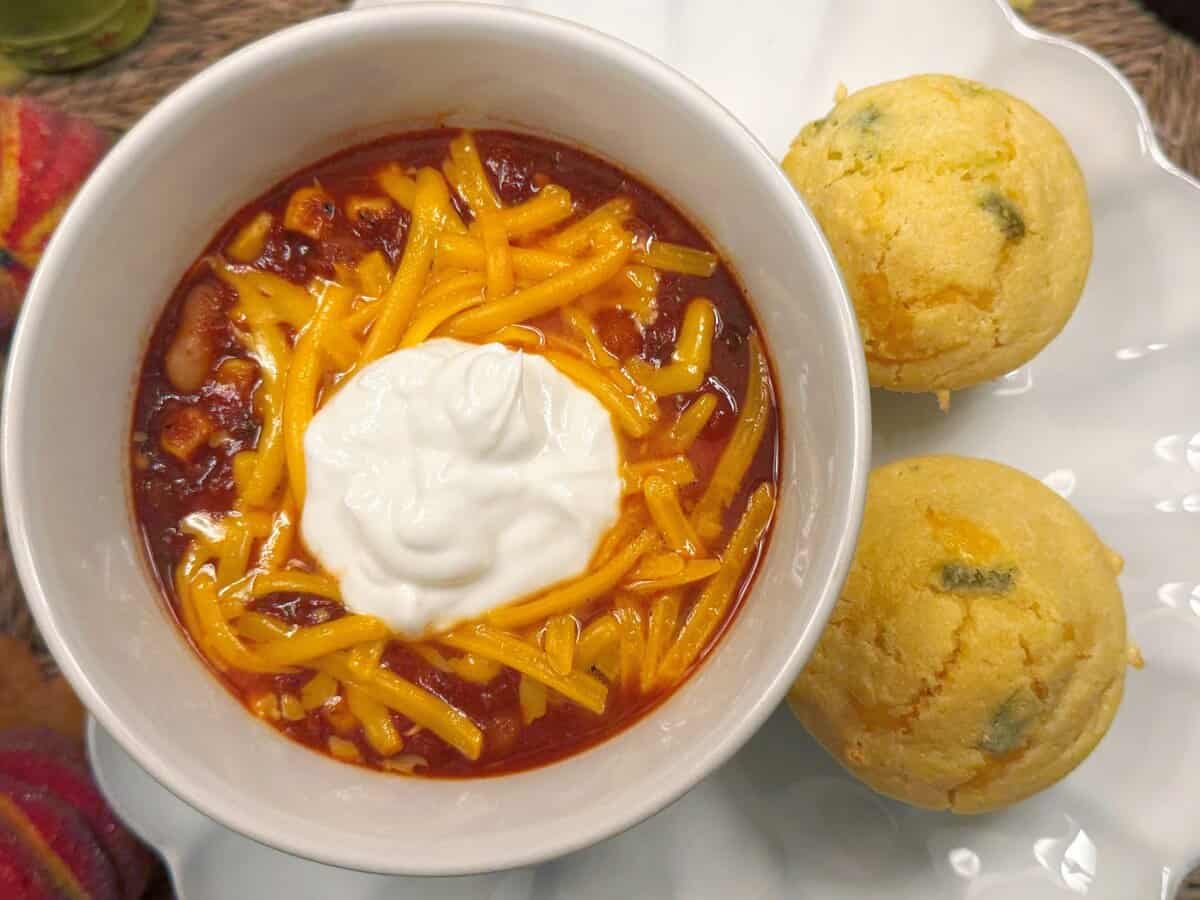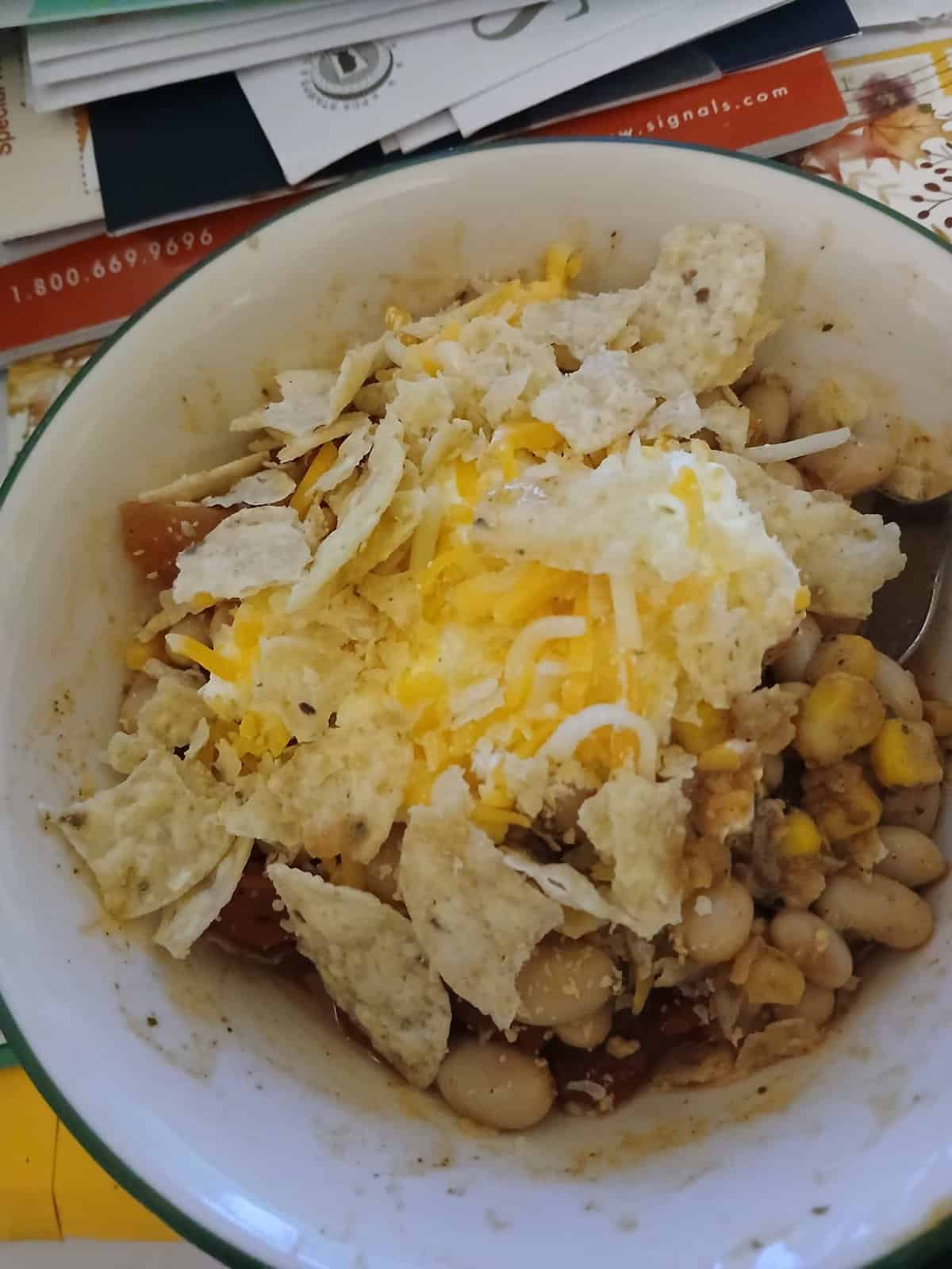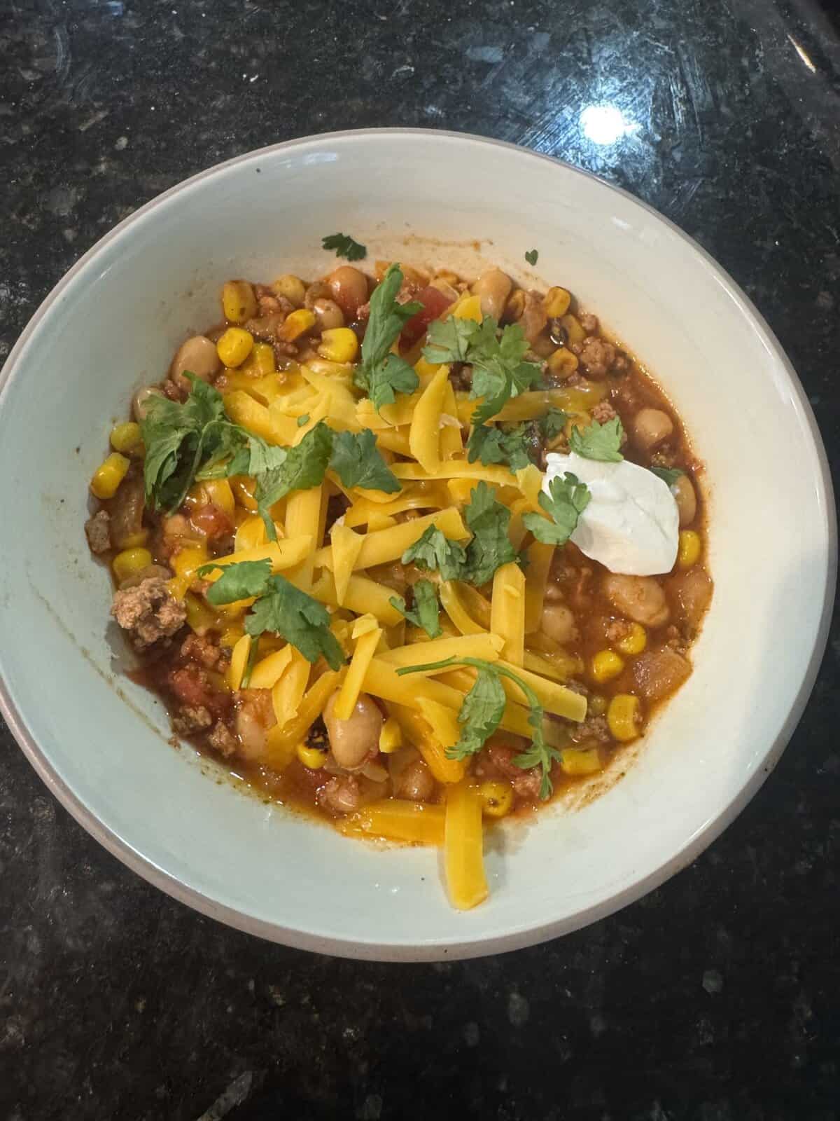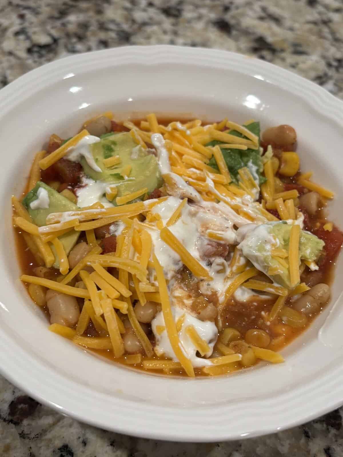 - Toppings: Crushed tortilla chips freshly grated cheese (I like sharp cheddar), sour cream or plain non-fat Greek yogurt, freshly chopped cilantro, avocado