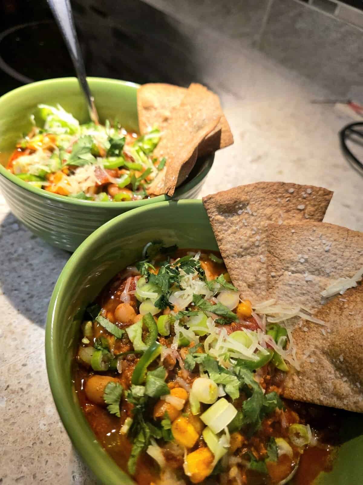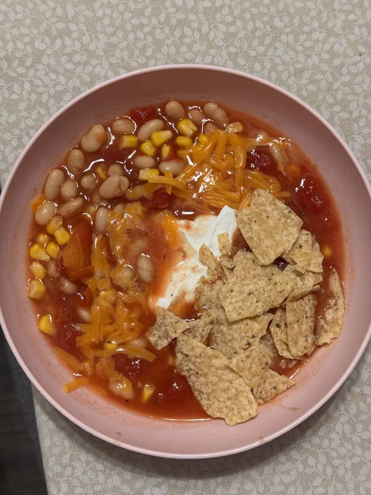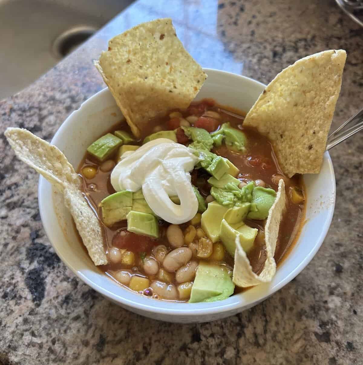 My daughter is picky about soups, but she actually ate and liked this soup. I think the tortilla chips and cheese on top made the difference. For me, I liked that it was healthy-ish but didn’t taste like diet food.