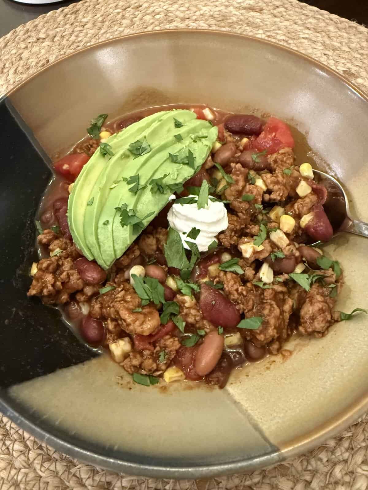Made in crockpot and added ground turkey. Delicious topped with cheese, Greek yogurt, and jalapeños!
