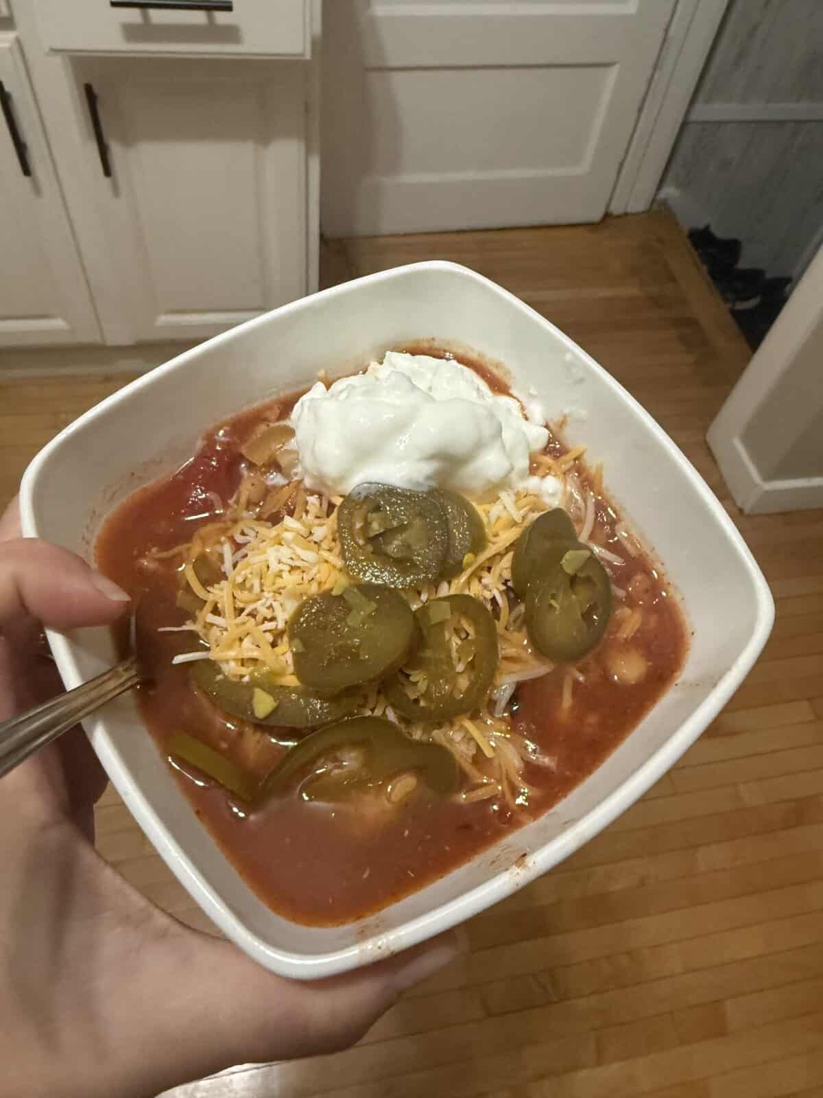 This was so simple and quick to throw together, and warmed me up just as the colder weather blows in. I added ground turkey, and the cheddar + sour cream toppings definitely elevated! Another big pro: only 5 minutes of dish washing 🤪 Thanks Erin!