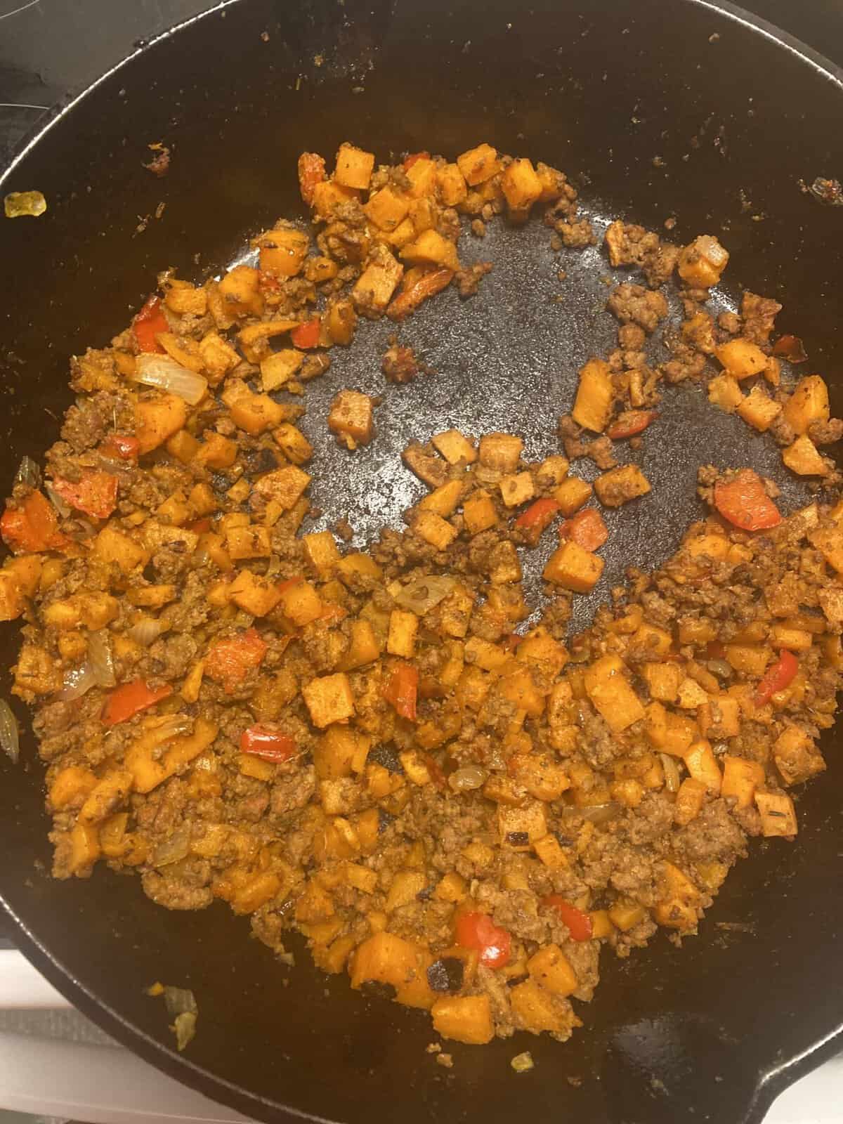 - Continue cooking and breaking up the beef, until the potatoes and onions are tender and the meat is fully cooked through, about 6 to 8 minutes more.