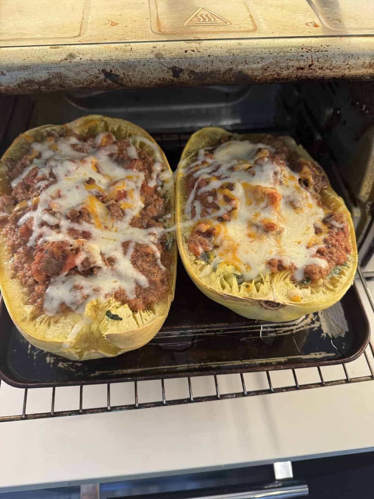 I made this last night, It was delicious. I used ground beef instead, and cooked some fresh spinach down and dried it on some paper towels before mixing it in. I also layered mine in the squash because I felt they were deep enough. Will make it again.It was so filling. And that trick to cut open the squash saved me so much time. Thanks