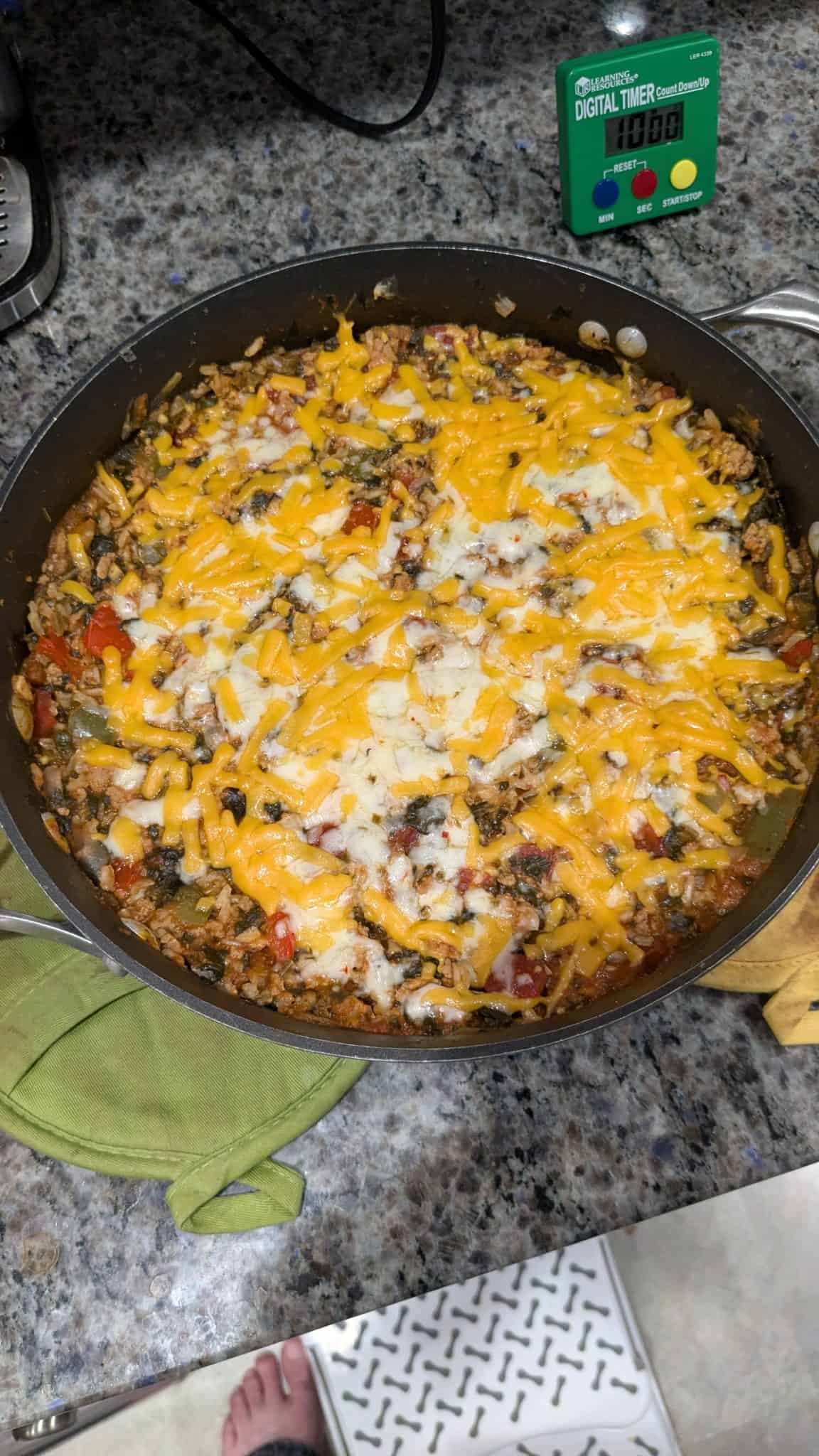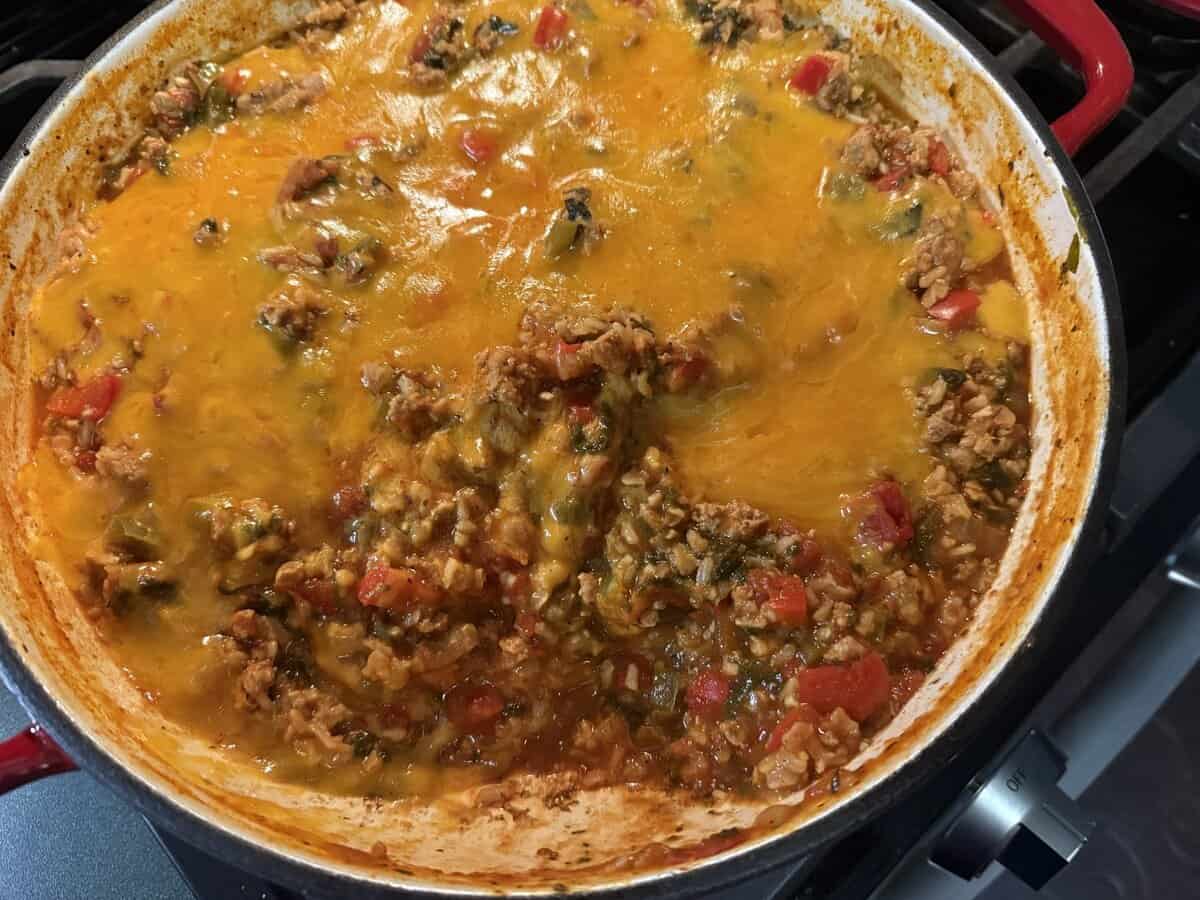 A mix of ground turkey (or ground beef), red and green bell peppers, brown rice, cheese, and a few sneaky extra vegetables that no one will complain about and you’ll feel happy you included, this recipe tastes like a stuffed pepper, no actual stuffing required.